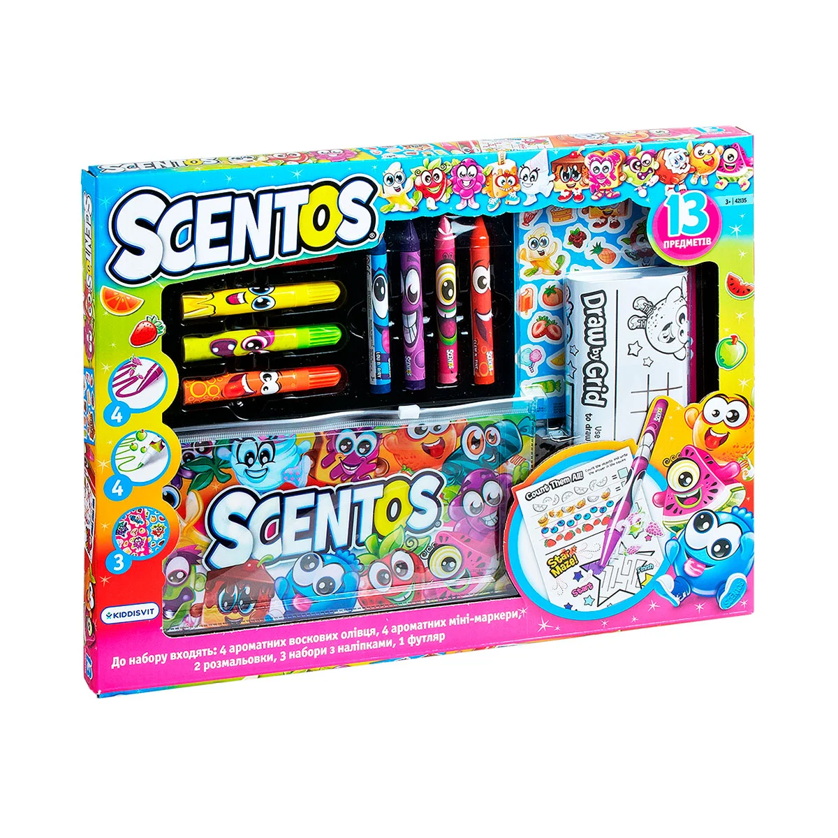Scentos КУМЕДНА КОМПАНІЯ – великий набір для творчості, який точно не залишить байдужим ні дитину, ні її батьків! Особливості: Даний набір представлений в оригінальній упаковці і може бути прекрасним подарунком для творчої дитини. До набору КУМЕДНА КОМПАНІЯ входить: Набір для малювання Scentos стане корисний для розвитку у дитини: Рекомендовано для дітей віком від 3-х років.