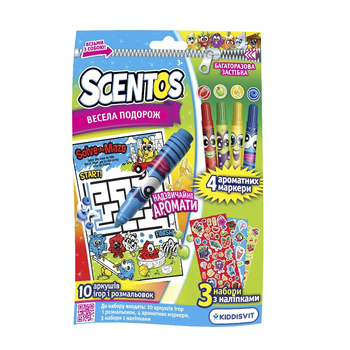 Завдяки зручній багаторазовій застібці на упаковці набір зручно брати з собою, куди б Ви не вирушили. До набору входять маркери та наліпки з чудовими фруктовими ароматами на натуральній основі, а також 10 аркушів з цікавими завданнями.