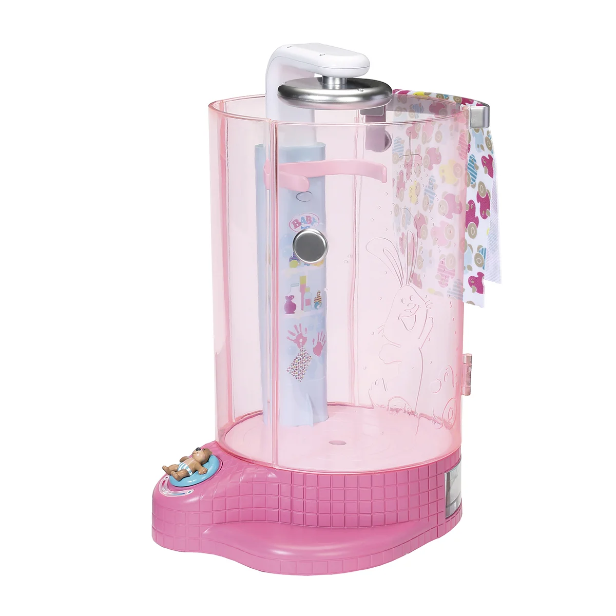 Зустрічайте неймовірно стильний і сучасний аксесуар для вашої улюбленої Бебі Борн – автоматична душова кабінка! Тільки подивіться, наскільки вона реалістична і в той же час виконана у фірмовому стилі Бебі Борн: прозорі дверцята з кроликом і каченям, зручний душ з кріпленням (який підходить і для Бебі Борн, і для Сестрички) і рожевий рушник! Висота душа регулюється. Залийте воду в кабінку, закріпіть лялечку і поверніть важіль у вигляді ведмедика – і водичка поллється! Це так зручно і весело! Функціонал: У наборі: Живлення: 4 батарейки AA (не в наборі) Гра з таким душем буде розвивати в дитині уяву, вміння грати і турботу.