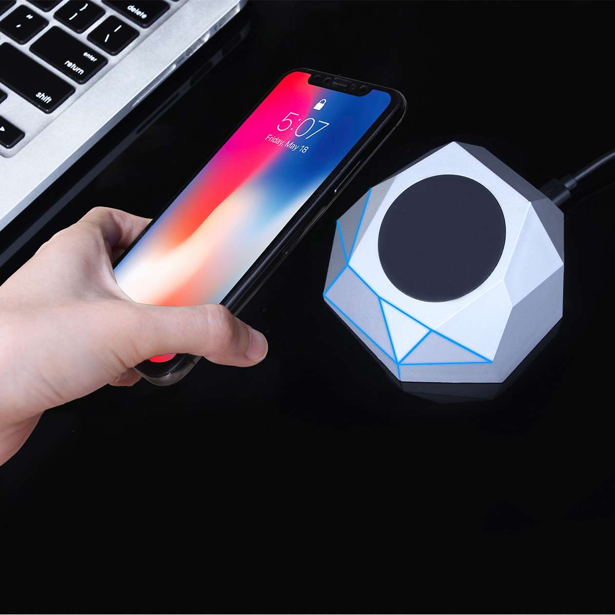 За допомогою бездротового зарядного пристрою XOOPAR – GEO DOCK Ви можете заряджати смартфони, не турбуючись про роз’єми або кабелях. Пристрій заряджає телефон завдяки вбудованій функції бездротової зарядки. В комплект входить: