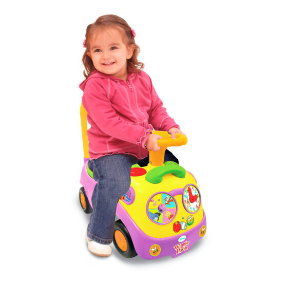 • На капоті є годинник зі стрілками, що рухаються, диск з персонажами мультфільму, а також іграшковий телефон для ще більш захоплюючої гри.