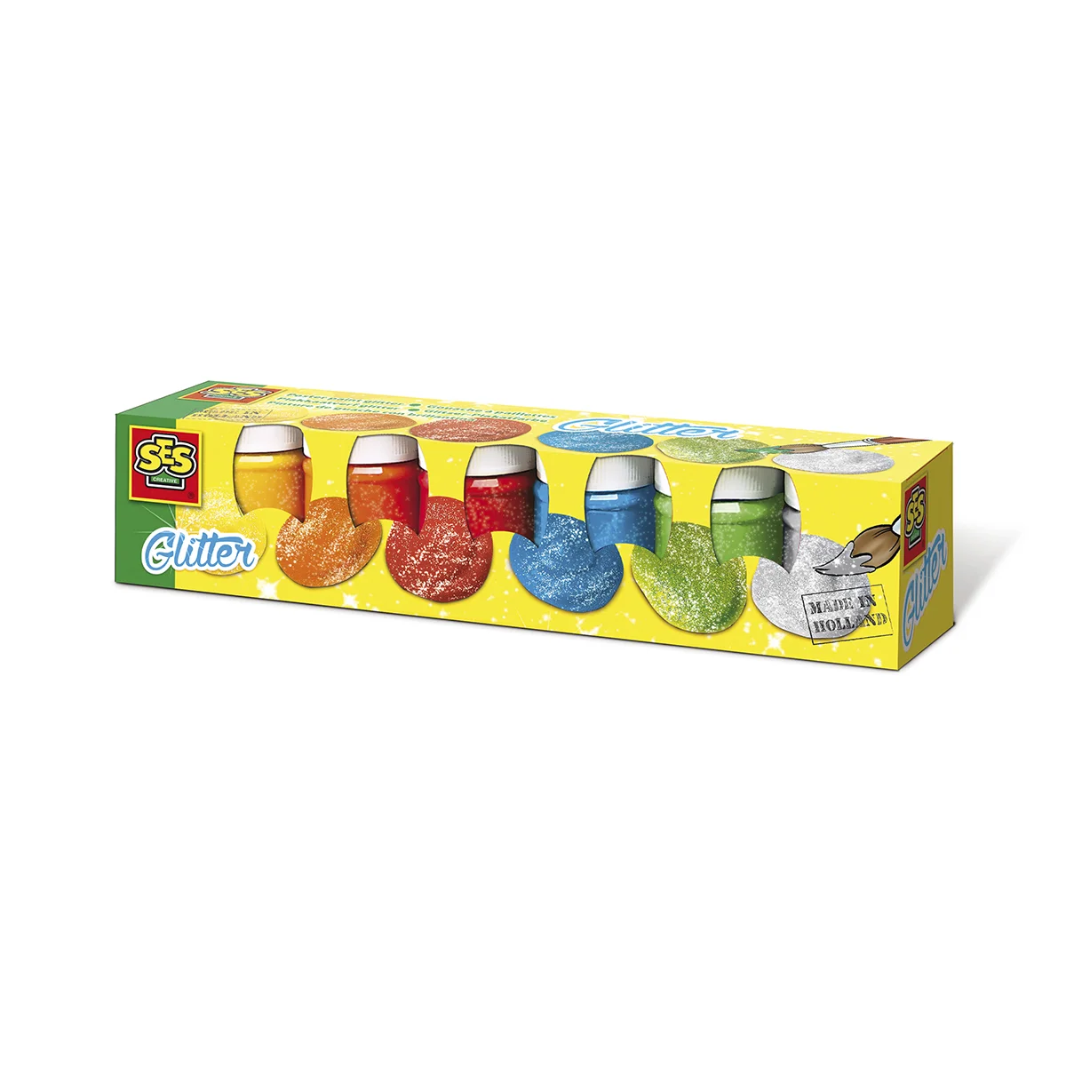 Набір для малювання складається з 6 баночок з гуашшю різного кольору з блискітками.