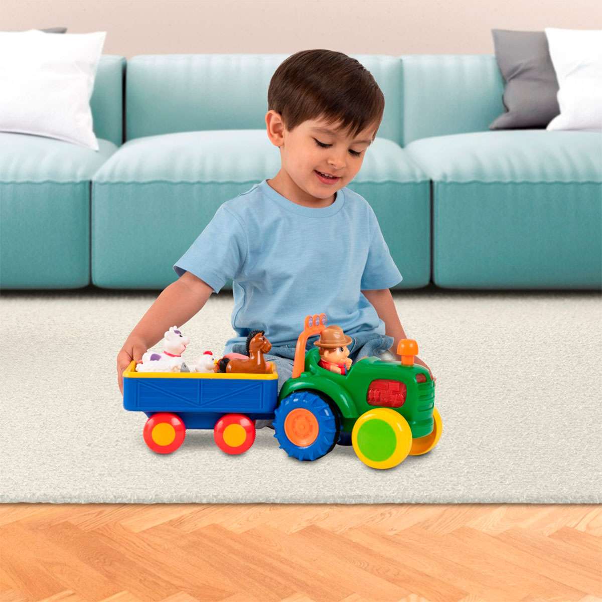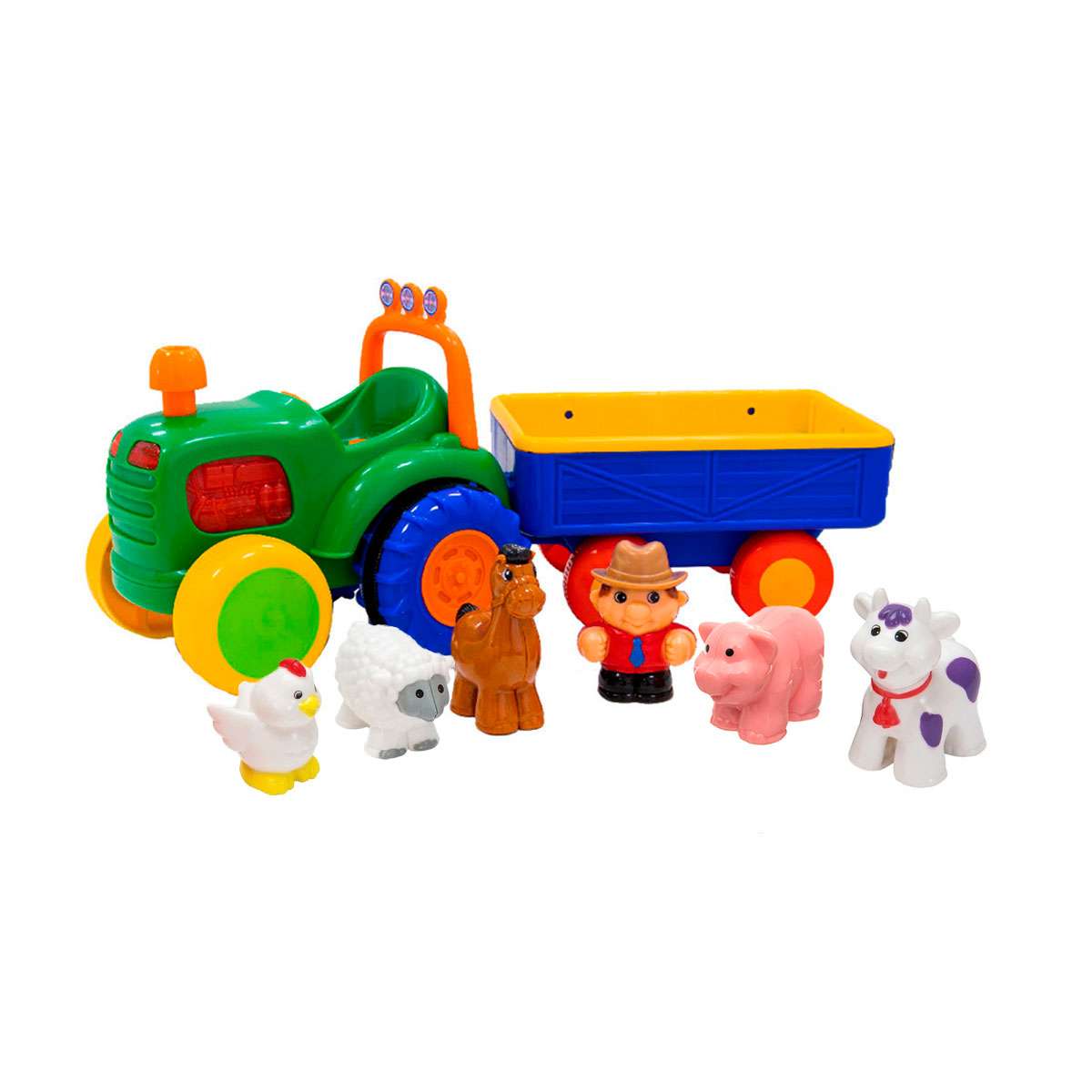 Іграшка на колесах ТРАКТОР З ТРЕЙЛЕРОМ озвучений українською мовою – це яскрава музична іграшка, яка розважить малюка сяючими вогниками, приємною музикою і веселими звуками.