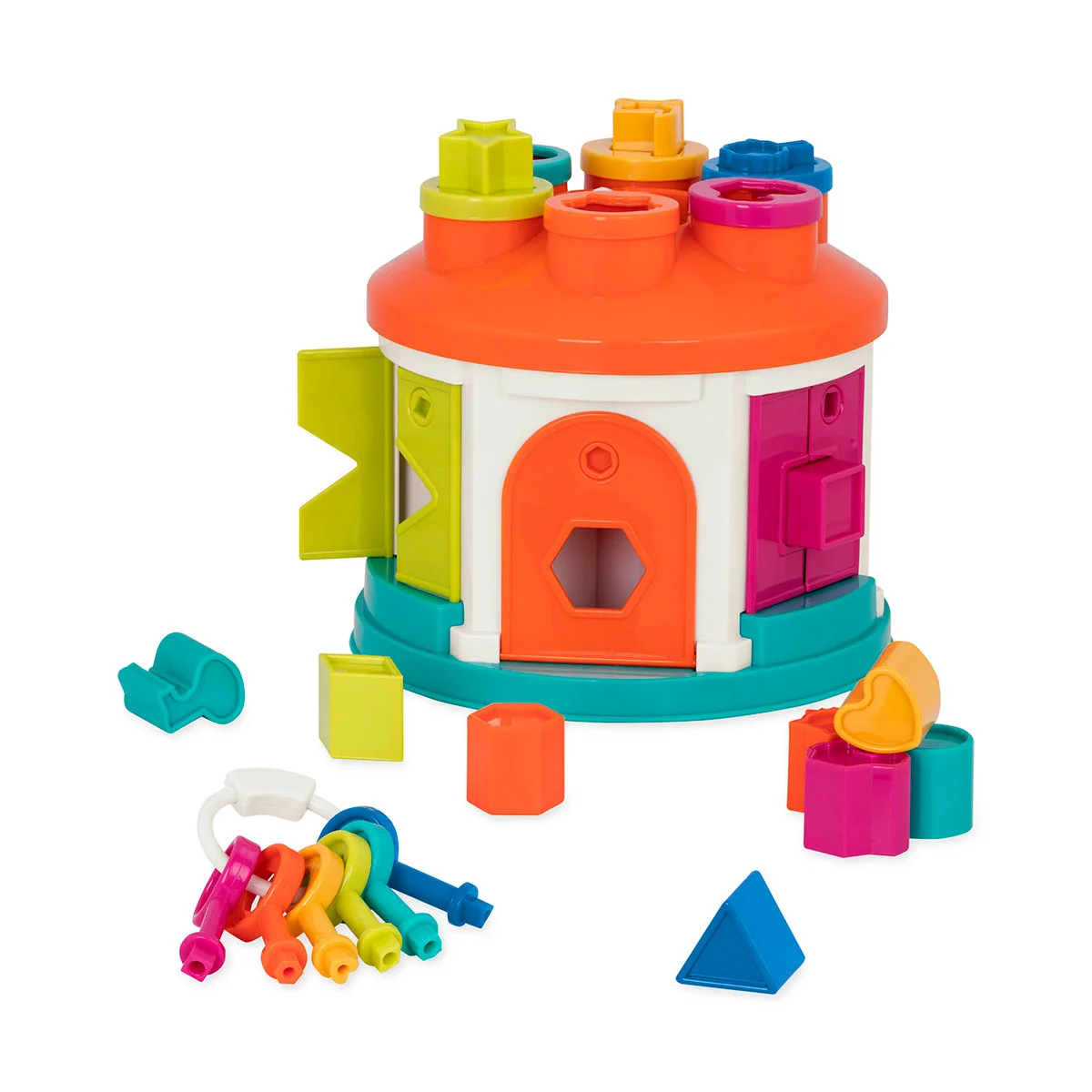 - До набору входять 12 фігурок різних форм і кольорів, які потрібно правильно підібрати до відповідних отворів. Чи знаходяться ці отвори на даху будиночка або в бічних віконцях, доведеться з’ясувати малюкові.