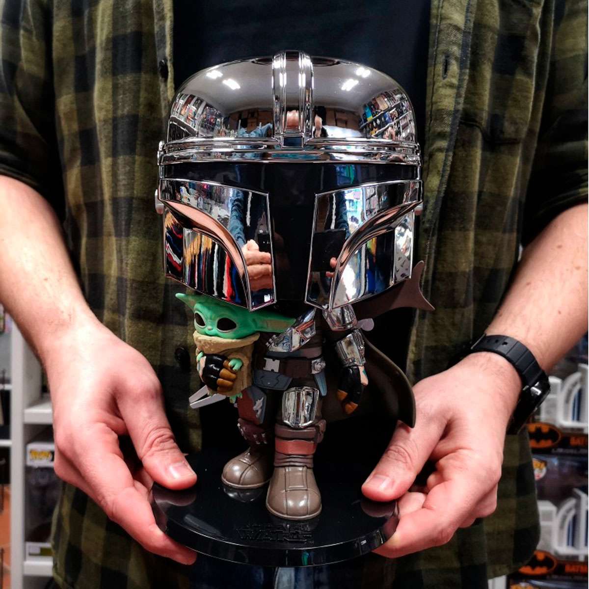 Вінілова ігрова фігурка з головою, що трясеться, FUNKO POP! – МАНДАЛОРЕЦЬ В ХРОМІ З МАЛЮКОМ стане чудовим подарунком для любителів серіалу «Мандалорець» від творців “Зоряних Війн”.