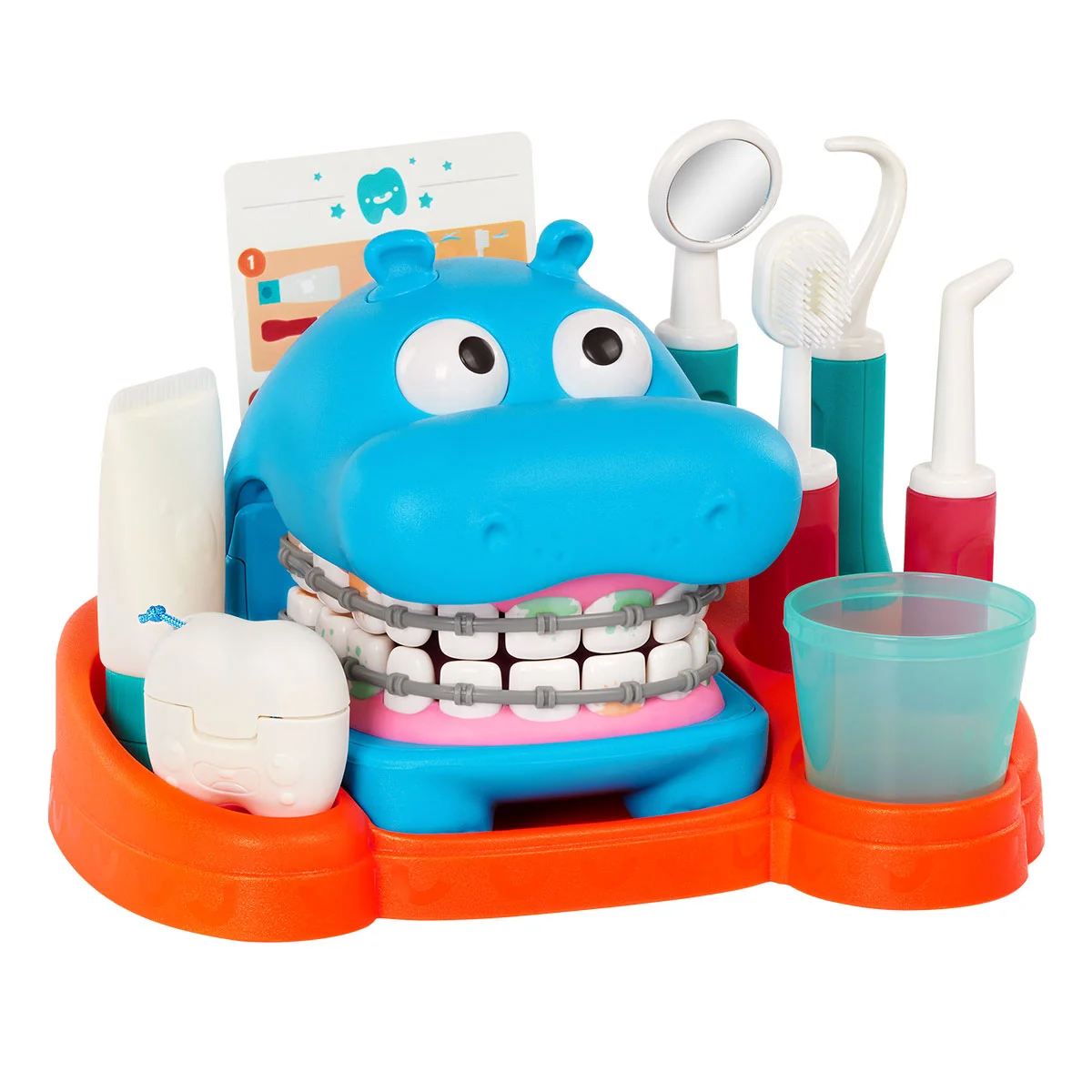 Відкрийте ротик і скажіть: “Ааааа”! Час чистити зубки разом з веселим бегемотиком в ігровому наборі – БЕГЕМОТИК У СТОМАТОЛОГА! З його допомогою ви можете познайомити малечу в ігровій формі зі здоровими звичками по догляду за ротиком і зубками. У ньому є усі необхідні аксесуари для догляду за зубками бегемотика.