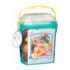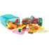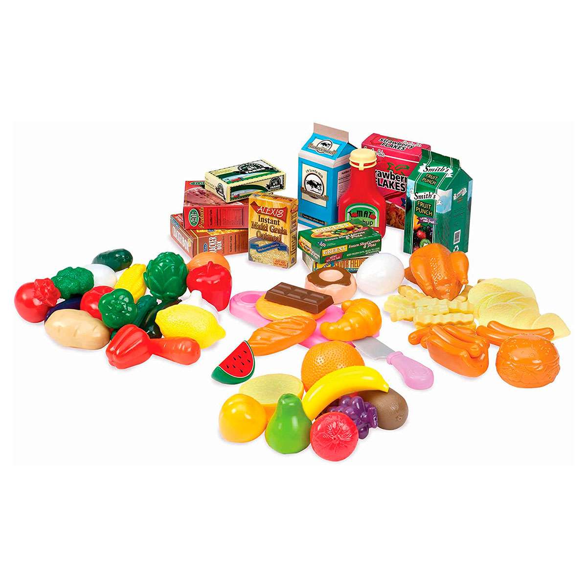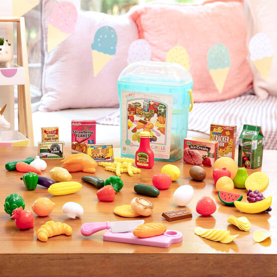 - До набору входить: контейнер для зберігання з кришкою, що замикається, і зручною ручкою, обробна дошка, пластиковий ніж, продукти в коробках і пластикові фрукти, овочі та інші продукти харчування.