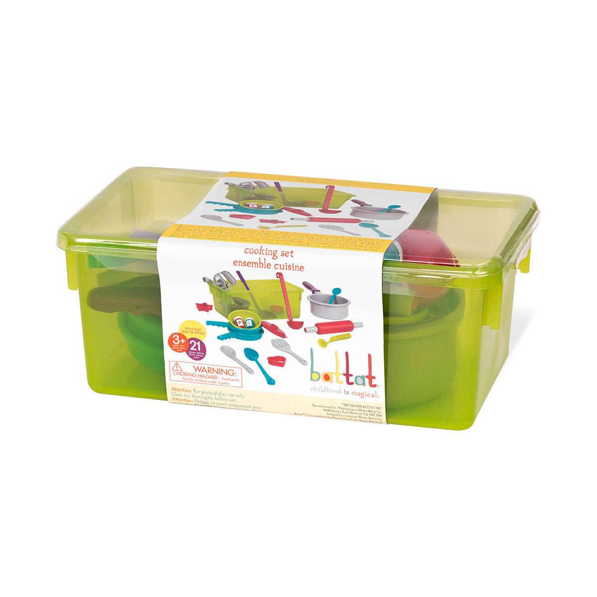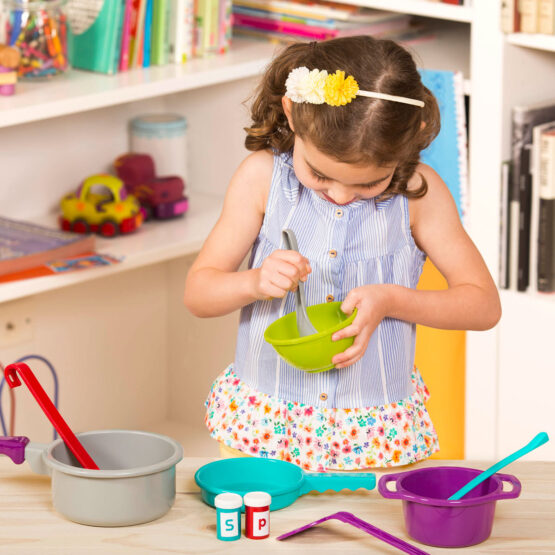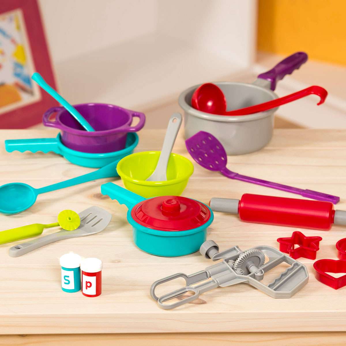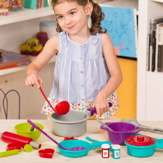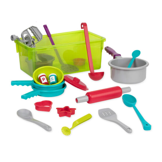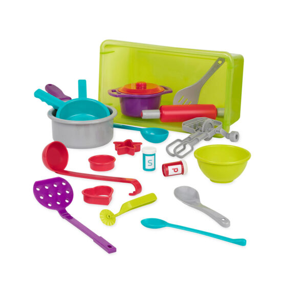 У цьому чудовому наборі є все, що необхідно маленькому кухареві для приготування будь-яких страв, які тільки можна собі уявити: каструлі, прилади та інші кухонні приналежності. До набору входить: 21 аксесуар (каструлі, сковорідка, миска, ополоник, ложки, лопатки, скалка, сільничка, перечниця, формочки, круглий «ніж» для тіста, кейс для зберігання та інші аксесуари). Розмір упаковки: 33.5 x 19.5 x 13 cm. Рекомендовано для дітей у віці старше 3 років.