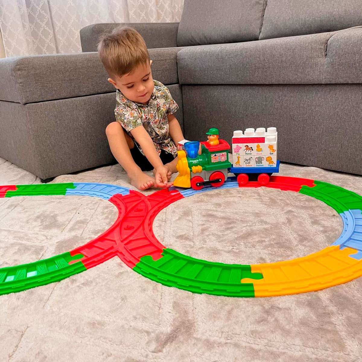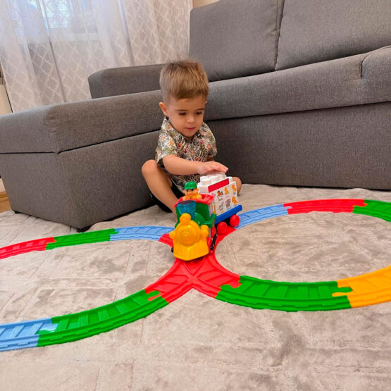• В комплекті набір елементів колії. Паровозик може рухатися як по коліях, так і самостійно