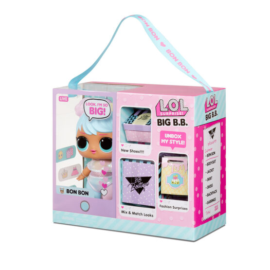 Набір з мега-лялькою L.O.L. Surprise! серії “Big B.B.Doll” – Бон-Бон – це найбільша лялечка L.O.L., яку Ви бачили Стильна подружка тільки-но повернулася після шопінгу та поспішає показати всі свої покупки. Вона навіть може зняти модний огляд-розпаковку, адже в наборі у неї є стіл, зручне крісло і навіть задній фон! У цієї великої крихітки – справжній одяг, стильний рюкзак та модні сережки, які, за допомогою спеціальних насадок, перетворюються на кліпси для дівчинки!