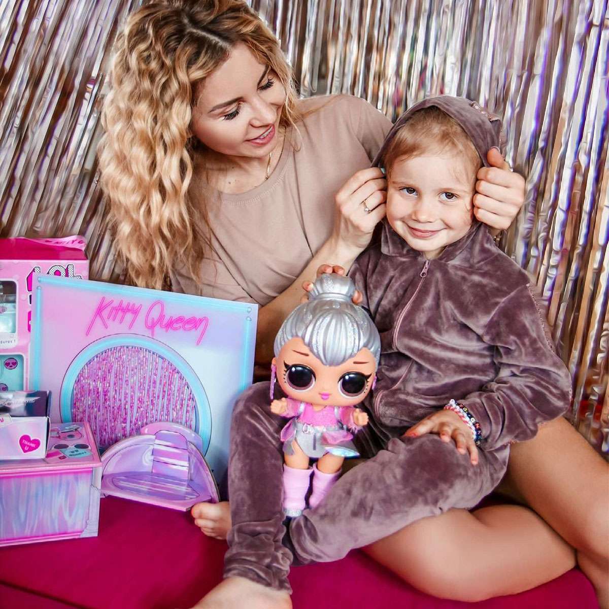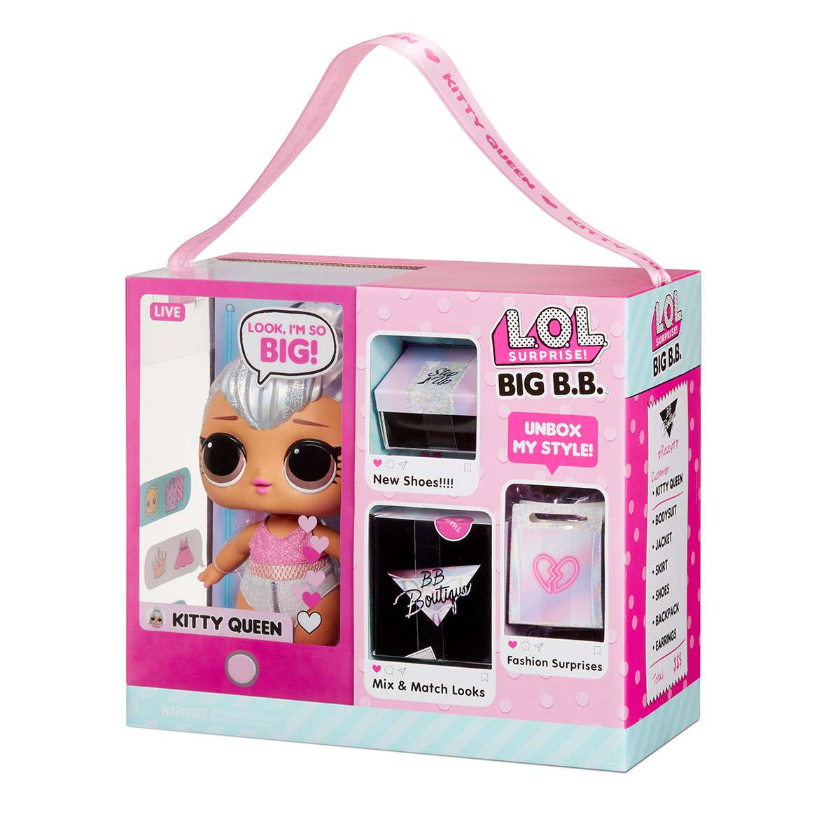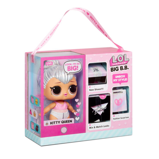 Набір з мега-лялькою L.O.L. Surprise! серії “Big B.B.Doll” – Королева Кітті – це найбільша лялечка L.O.L., яку Ви бачили! Стильна подружка тільки-но повернулася після шопінгу та поспішає показати всі свої покупки. Вона навіть може зняти модний огляд-розпаковку, адже в наборі в неї є стіл, зручне крісло і навіть задній фон. У цієї великої крихітки справжній одяг, стильний рюкзак та модні сережки, які, за допомогою спеціальних насадок, перетворюються на кліпси для дівчинки!