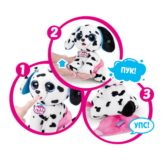 Знайомтеся з милими цуценятами-бешкетниками з колекції Pets Alive! Вони кумедні та вчаться ходити до туалету. Пригостіть їх кісточкою, щоб побачити, як вона чарівним чином змінює колір у роті цуценяти перед випорожненням назовні! Натисніть на вушко та почуйте милі щенячі звуки! Дізнайтеся, яке цуценя потрапило до вас і починайте веселу гру!
