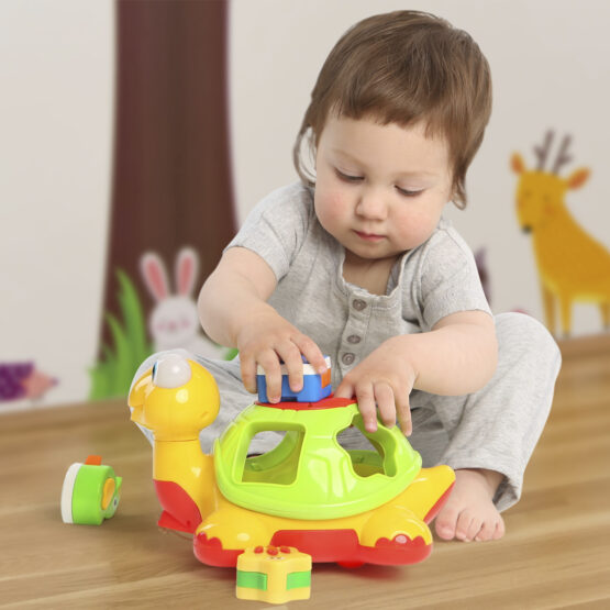 Якщо малюк впорався зі своїм завданням успішно, черепашка називає відповідну геометричну фігуру, колір або тварину, розповідає віршик про їх властивості або співає веселу пісеньку, сяючи яскравими вогниками.