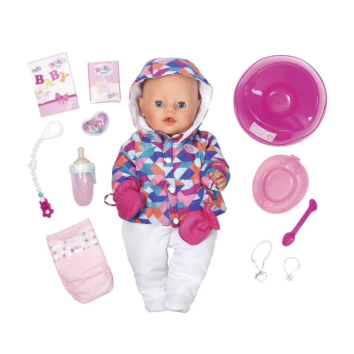 - 11 аксесуарів: тарілочка з ложкою, підгузник, пустушка, горщик, ланцюжок до пустушки, пляшечка, кашка, браслети, ID-картка.