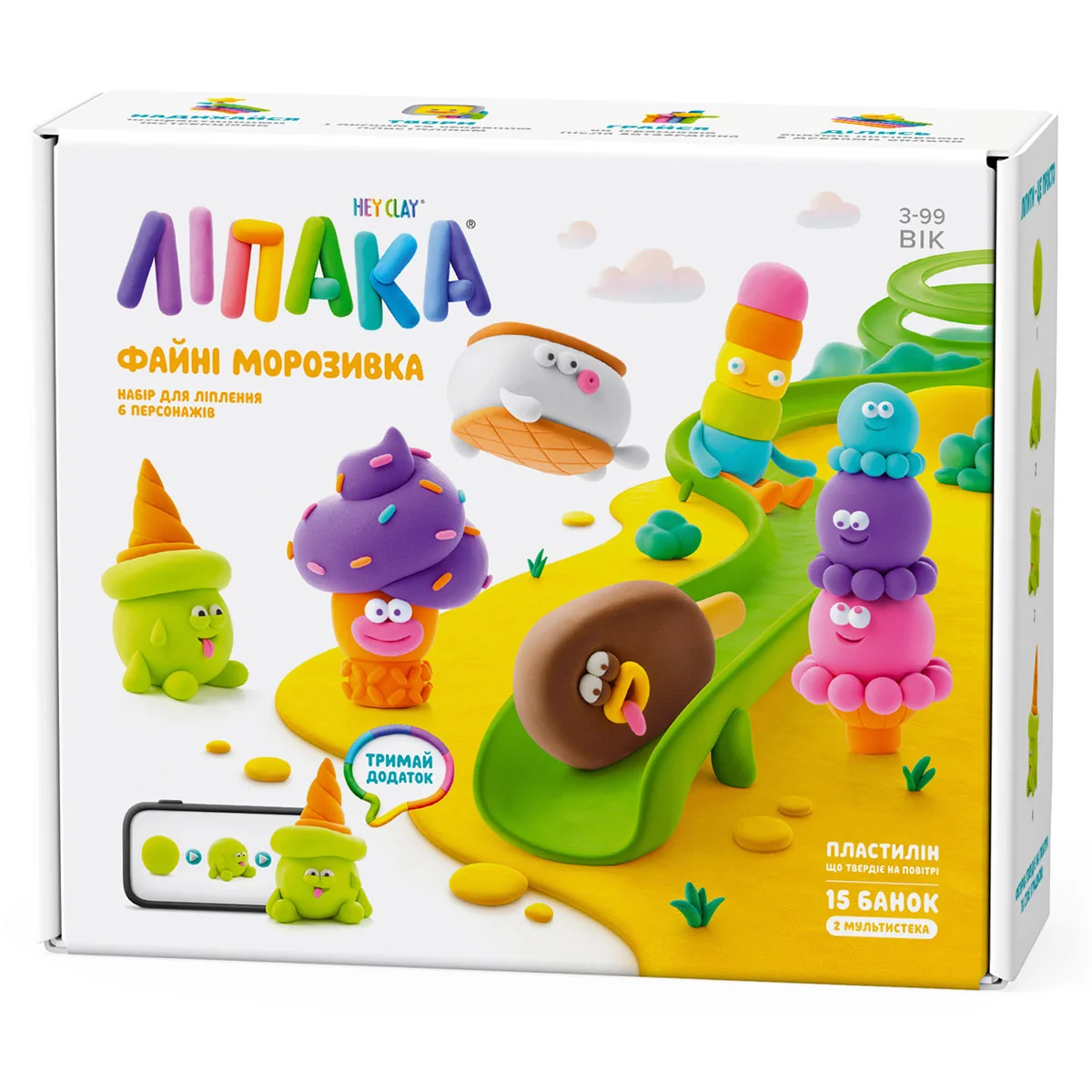 Меганабір пластиліну, що самостійно твердіє, ЛІПАКА – ФАЙНІ МОРОЗИВКА – розважить і малюків і дорослих. За допомогою анімаційних інструкцій в додатку HEY CLAY, Ви зможете зліпити 6 унікальних персонажів: Торнадика, Тепльодика, Кульконавтів, Єті Сендвіч, Ріжок Кувирок і Чоко Бро. Пластилін твердіє на повітрі протягом 24 годин, після чого можна гратися створеними фігурками.