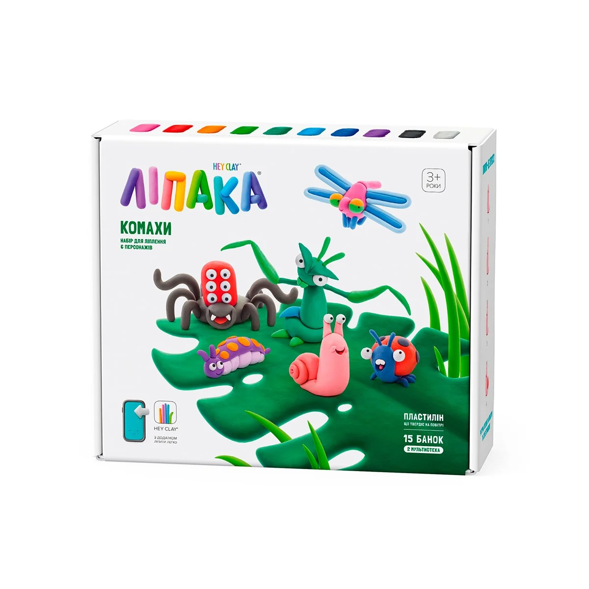 Меганабір пластиліну, що самостійно твердіє, ЛІПАКА – КОМАХИ – розважить і малюків, і дорослих. За допомогою анімаційних інструкцій в додатку HEY CLAY, Ви зможете зліпити кумедних комах і їхніх друзів: равлика, гусеницю, бабку, сонечко, богомола та павучка. Пластилін твердіє на повітрі протягом 24 годин, після чого можна гратися створеними фігурками.