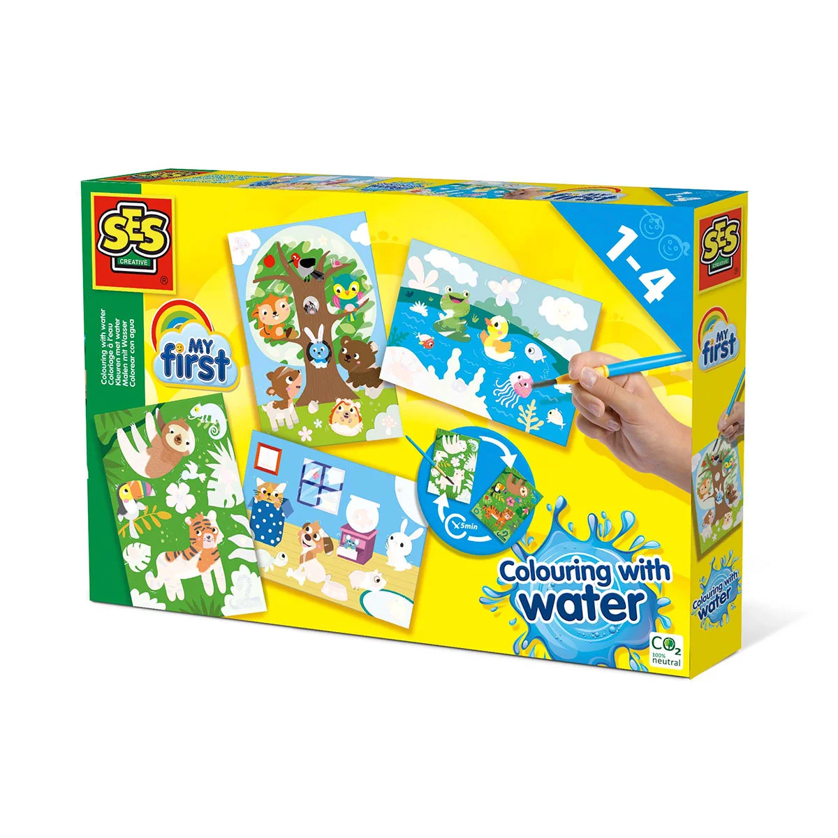В комплекті 4 картки з водними розмальовками, пензлик.