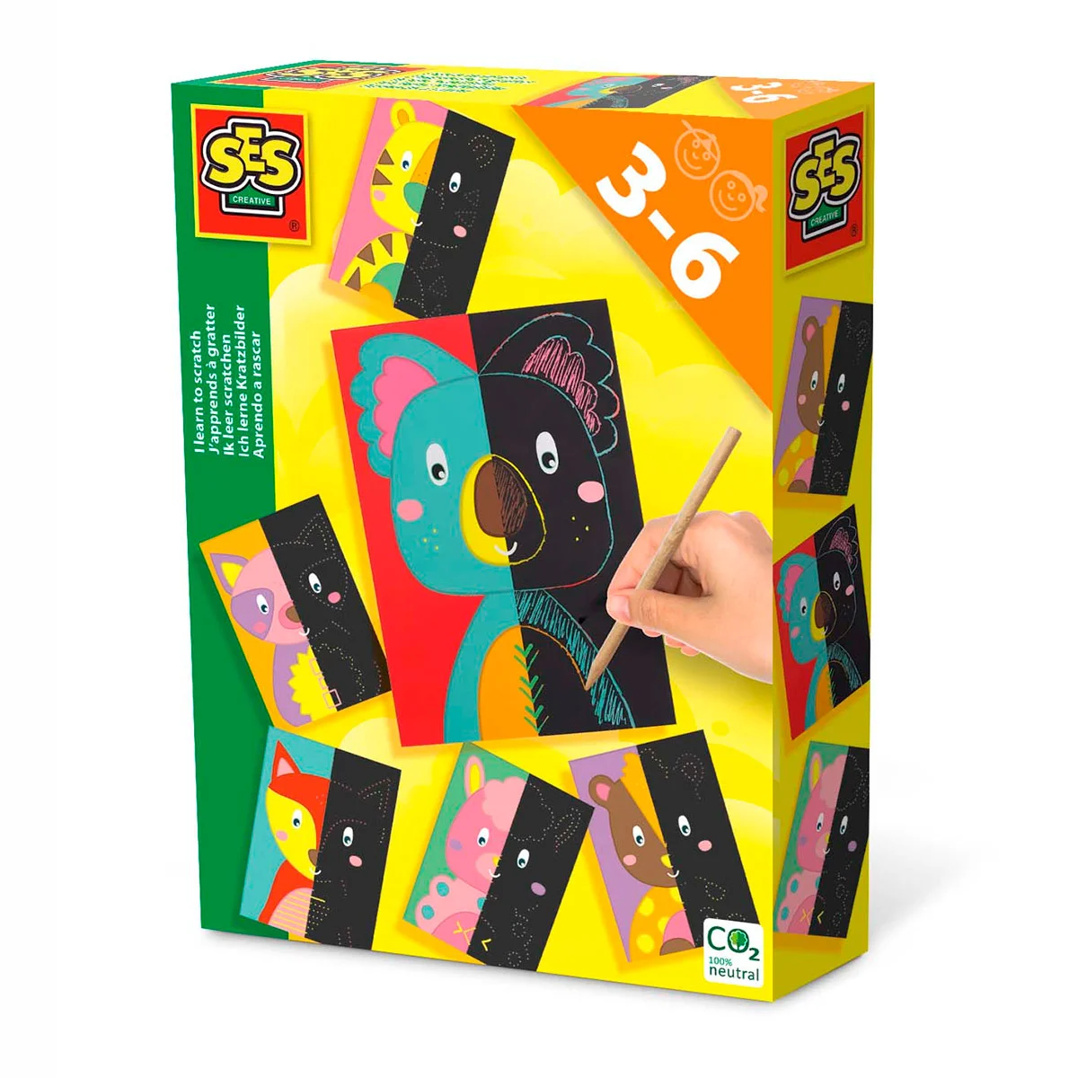 Шість малюнків кумедних тварин ще не закінчені. Ви завершите малюнки? На чорних скретч-картках є інструкції, тому ви можете точно скопіювати тварин. Використовуючи дерев’яну паличку для зняття верхнього шару, Ви можете слідувати вказівкам і розфарбовувати області. Ви також можете зробити власне неповторне творіння, намалювавши різні візерунки.