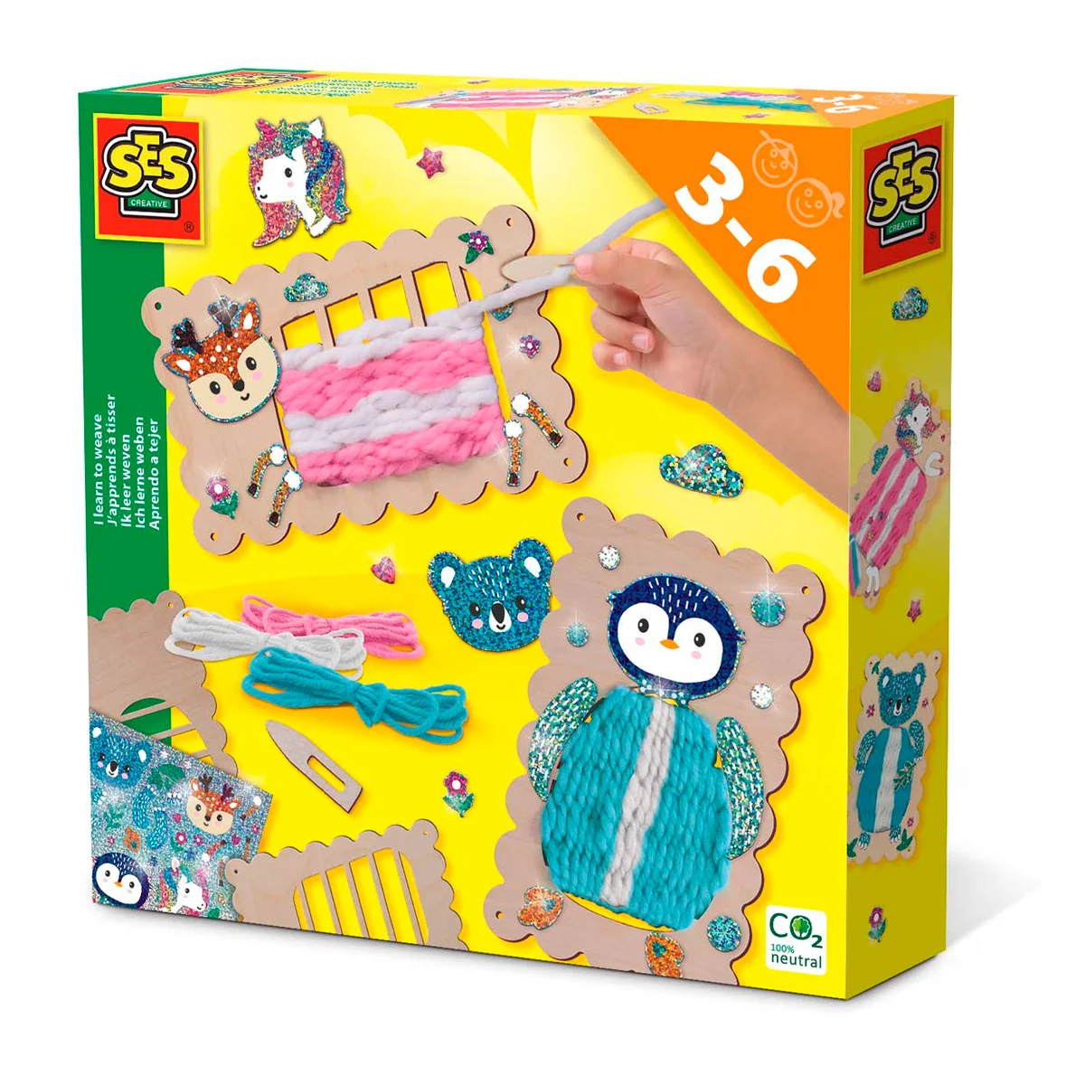 2 дерев'яних ткацьких верстата, триколірна нитка, наклейки, інструкція.