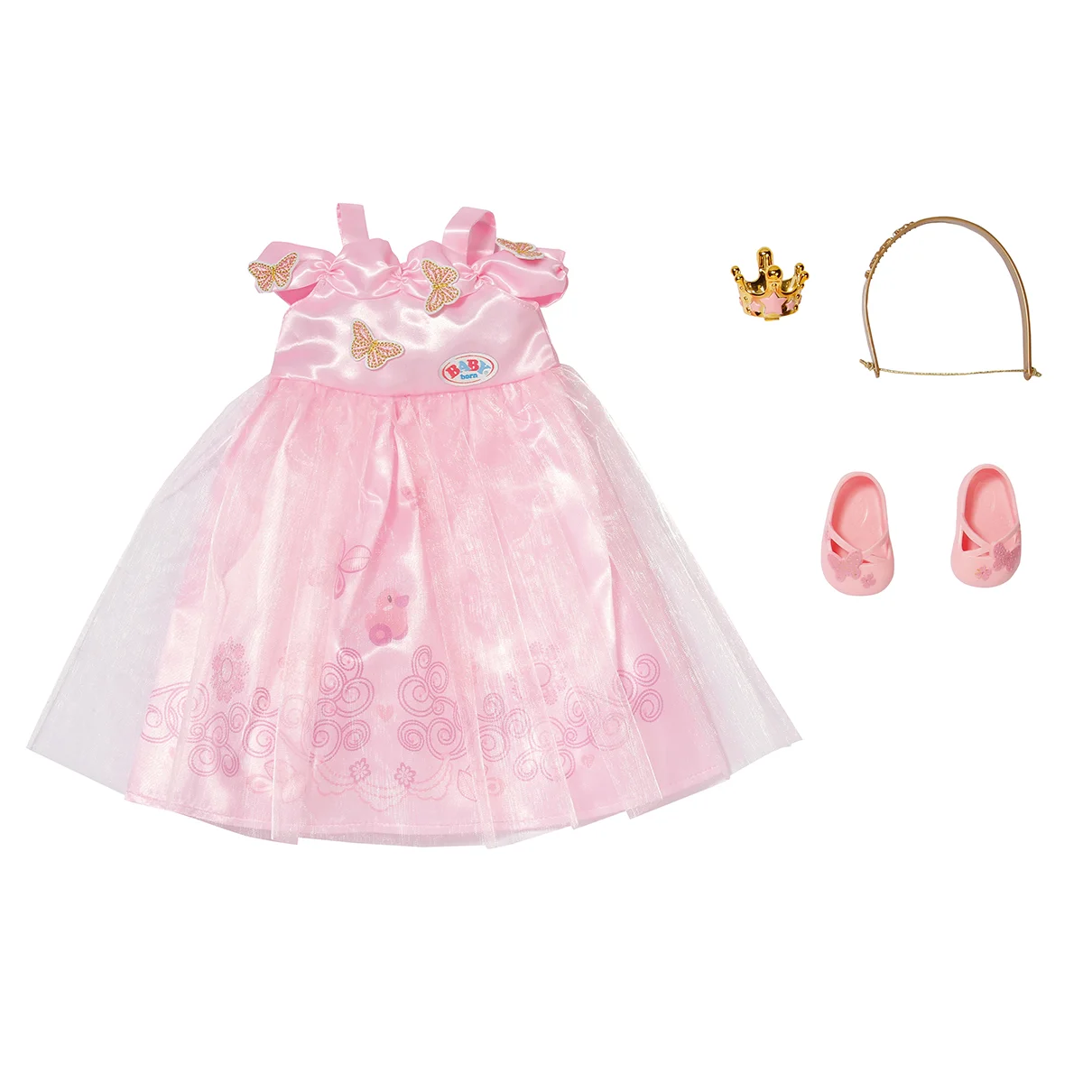 Лялечка BABY born виглядає дуже елегантною у своїй ніжно-рожевій сукні принцеси. Легкий фатин на спідничці, з милими орнаментами схожий на чарівну хмарку. Аплікації з метеликів літають по верху сукні. Ці прекрасні метелики є і на рожевих туфельках. І звичайно, справжній принцесі потрібна корона. Золотиста корона кріпиться за допомогою резинки для волосся. Одяг виготовлено з високоякісних матеріалів.