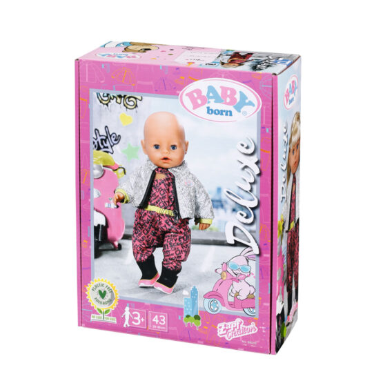 Набір одягу для ляльки BABY BORN серії “City Deluxe”- ПРОГУЛЯНКА НА СКУТЕРІ – яскравий та стильний, підійде як для веселої поїздки, так і для зустрічі з подружками.