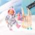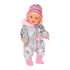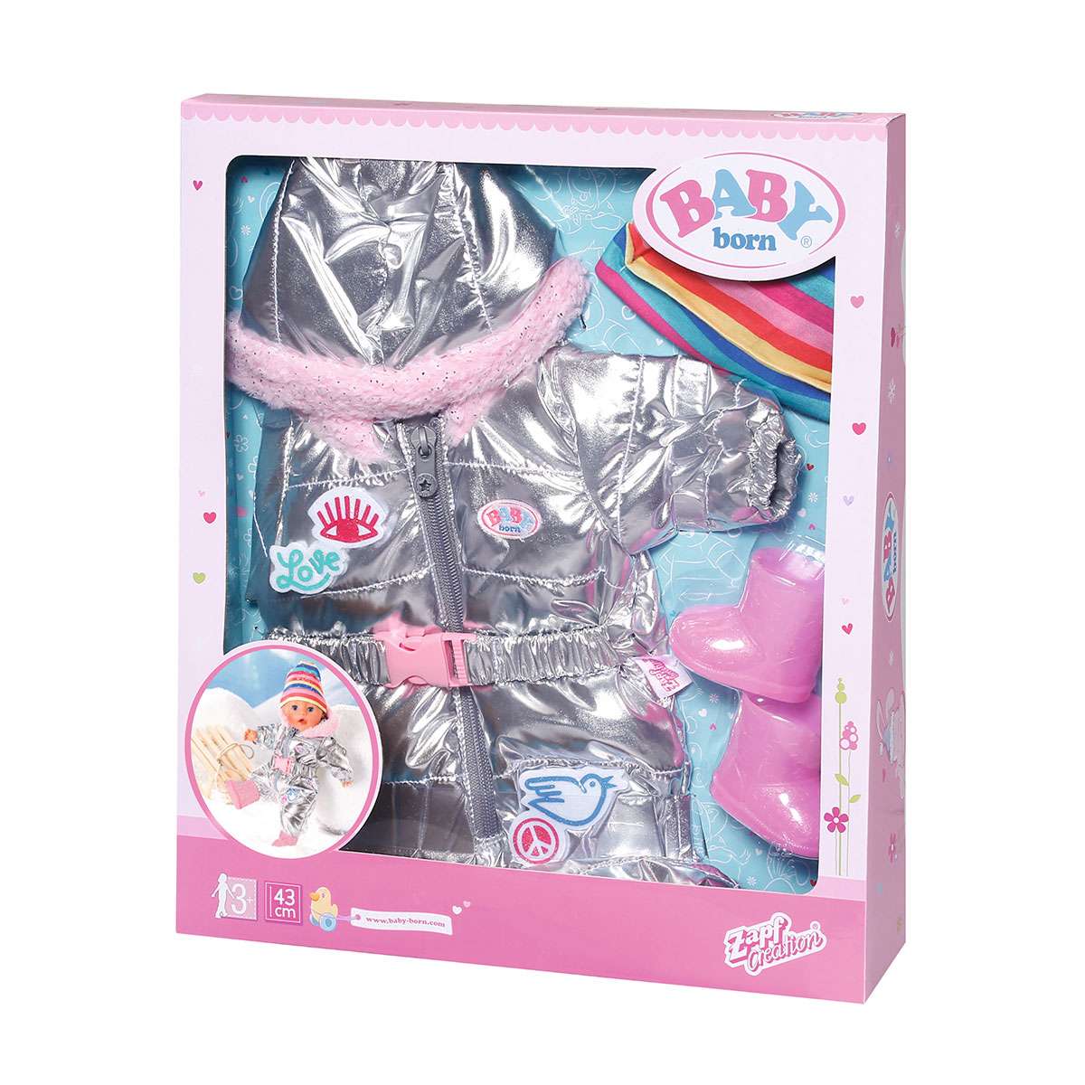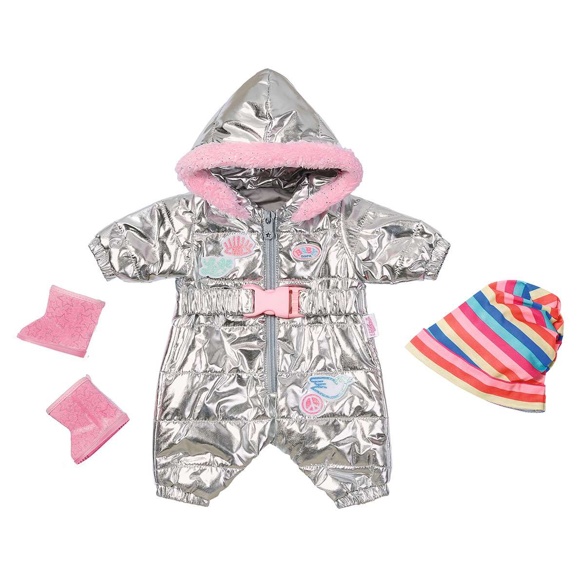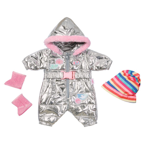 BABY born – справжня модниця, вона знає, як поєднувати зручність та красу! У неї в гардеробі так багато стильних речей. Тільки подивіться на цей комплект: сріблястий комбінезон, смугаста шапочка та рожеві чобітки. З ними крихітка завжди буде в теплі.