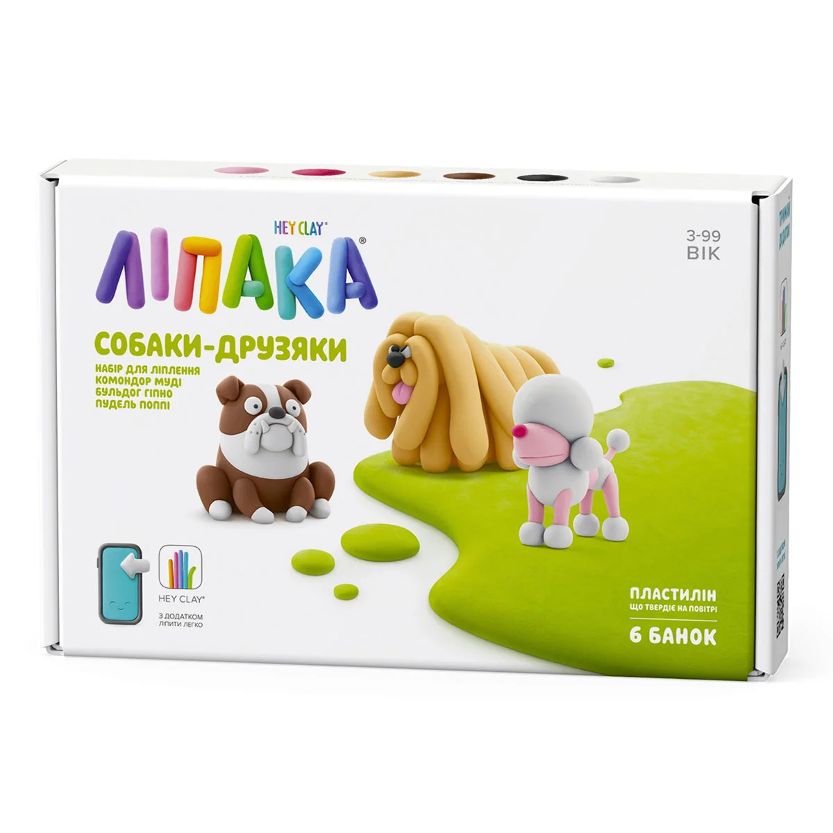 Набір пластиліну, що самостійно твердіє, ЛІПАКА – СОБАКИ-ДРУЗЯКИ: КОМОНДОР МУДІ, БУЛЬДОГ ГІПНО, ПУДЕЛЬ ПОППІ – розважить і малюків, і дорослих. За допомогою анімаційних інструкцій в додатку HEY CLAY, Ви зможете зліпити трьох кумедних героїв. Пластилін твердіє на повітрі протягом 24 годин, після чого можна гратися створеними фігурками.