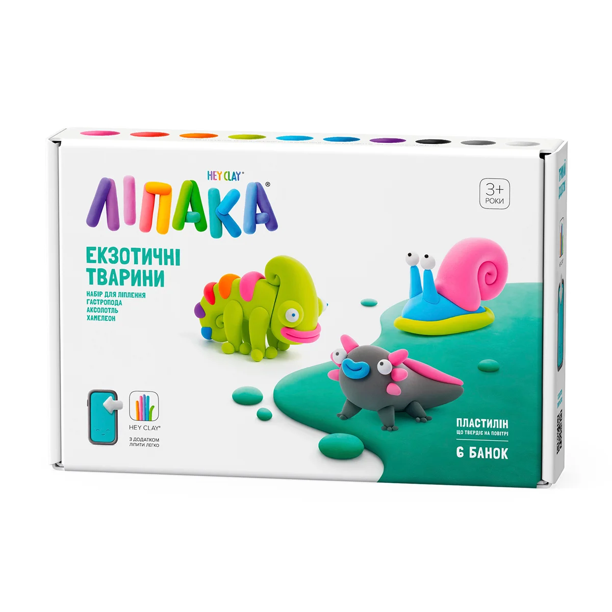 Набір пластиліну, що самостійно твердіє, ЛІПАКА – ЕКЗОТИЧНІ ТВАРИНИ: ХАМЕЛЕОН, ГАСТРОПОДА, АКСОЛОТЛЬ – розважить і малюків і дорослих. За допомогою анімаційних інструкцій в застосунку HEY CLAY, Ви зможете зліпити кумедних хамелеона, гастроподу й аксолотля. А завдяки компактним розмірам, набір зручно брати з собою. Пластилін твердіє на повітрі протягом 24 годин, після чого можна гратися створеними фігурками.