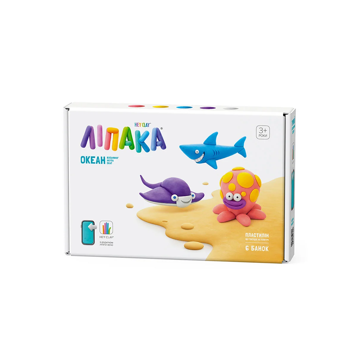 Набір пластиліну, що самостійно твердіє, ЛІПАКА – ОКЕАН: АКУЛА, ВОСЬМИНІГ, СКАТ – розважить і малюків, і дорослих. За допомогою анімаційних інструкцій в додатку HEY CLAY Ви зможете зліпити трьох мешканців підводного світу. Пластилін твердіє на повітрі протягом 24 годин, після чого можна гратися створеними фігурками.