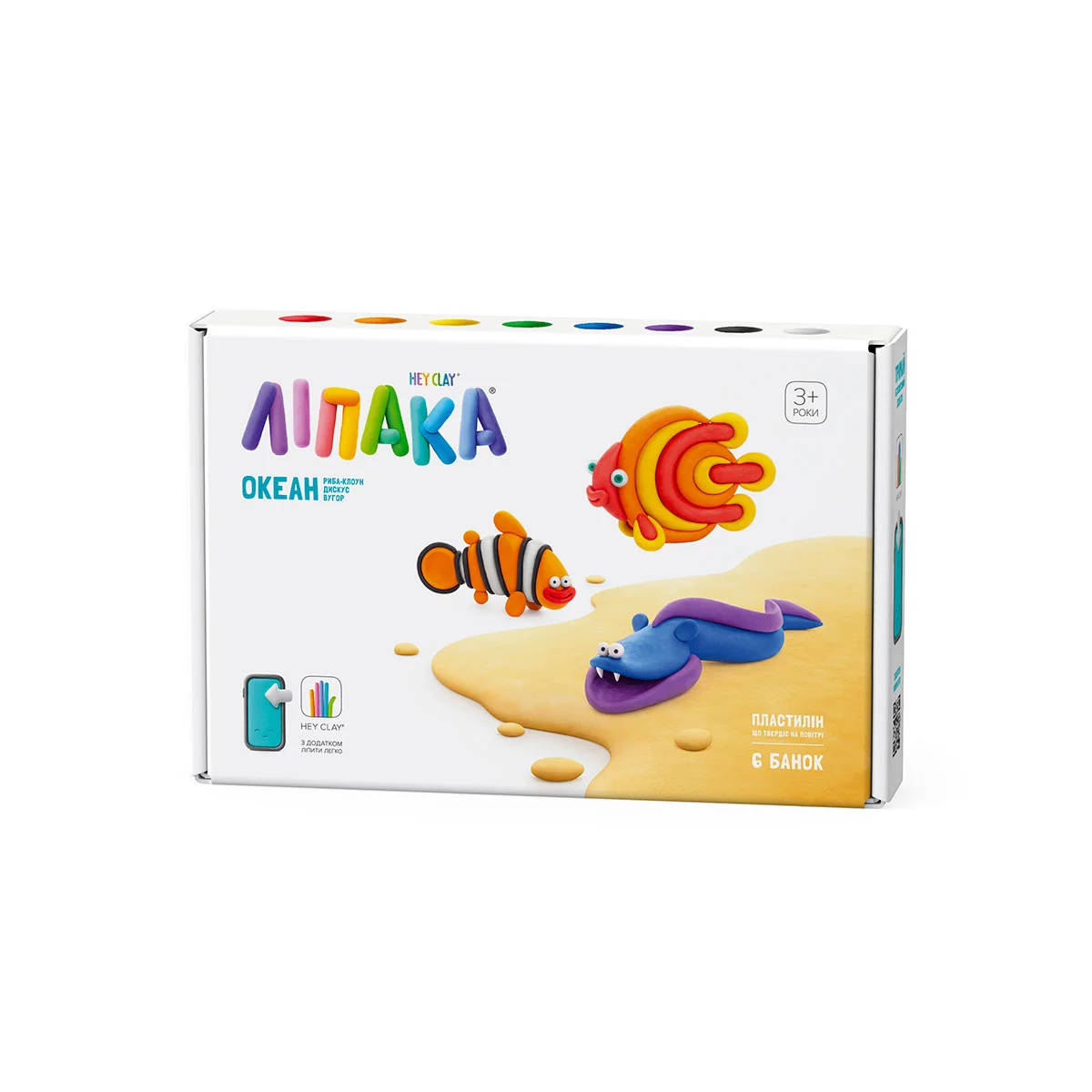 Набір пластиліну, що самостійно твердіє, ЛІПАКА – ОКЕАН: РИБА-КЛОУН, ДИСКУС, ВУГОР – розважить і малюків, і дорослих. За допомогою анімаційних інструкцій в додатку HEY CLAY Ви зможете зліпити трьох мешканців підводного світу. Пластилін твердіє на повітрі протягом 24 годин, після чого можна гратися створеними фігурками.