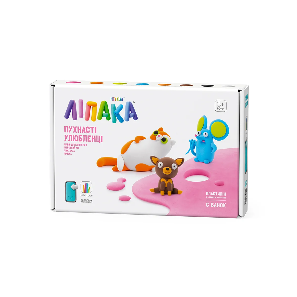 Набір пластиліну, що самостійно твердіє, ЛІПАКА – ПУХНАСТІ УЛЮБЛЕНЦІ: ПЕРСЬКИЙ КІТ, ЧИХУАХУА, МИШКА – розважить і малюків, і дорослих. За допомогою анімаційних інструкцій в додатку HEY CLAY, Ви зможете зліпити трьох кумедних тваринок. Пластилін твердіє на повітрі протягом 24 годин, після чого можна гратися створеними фігурками.