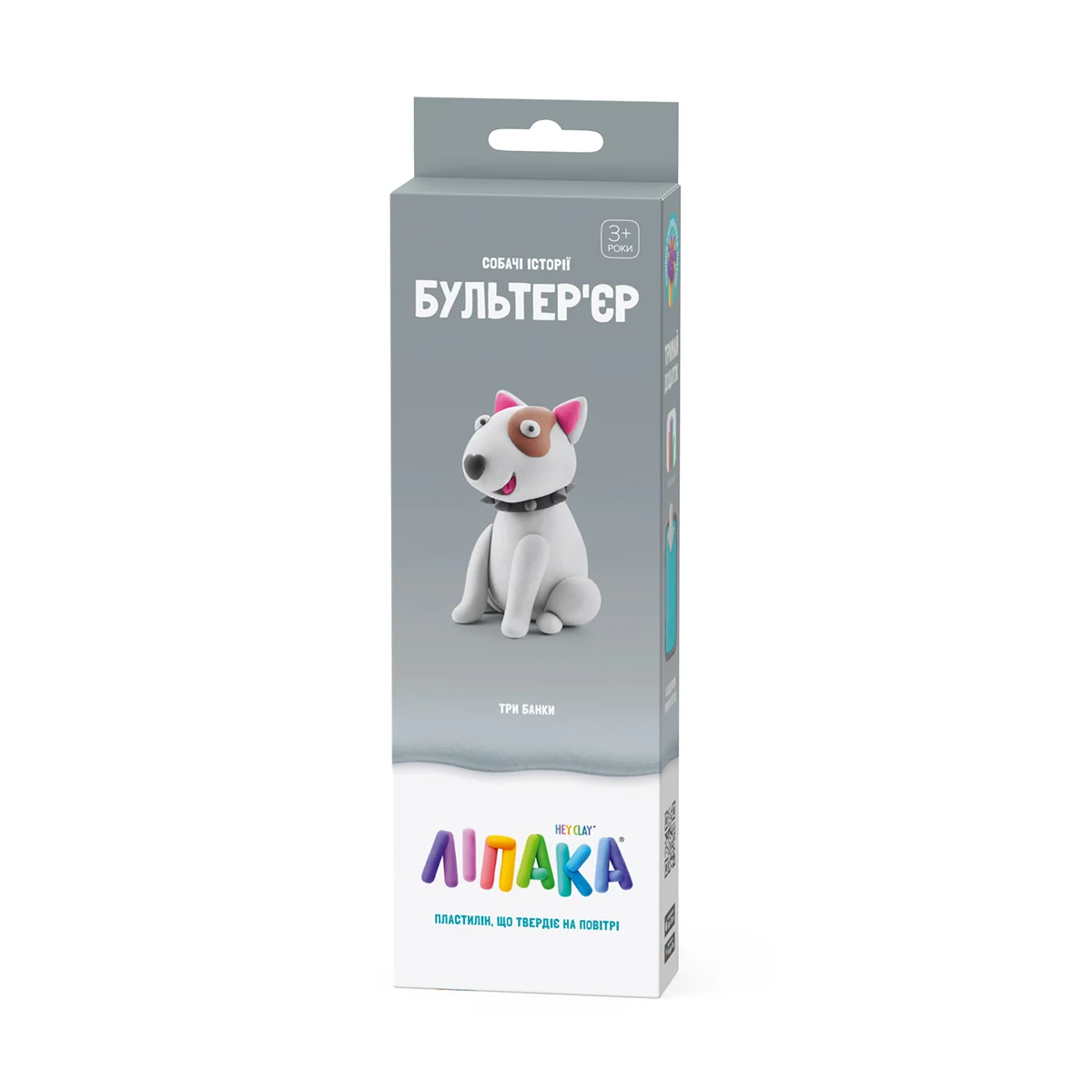 Набір пластиліну, що самостійно твердіє, ЛІПАКА – СОБАЧІ ІСТОРІЇ: БУЛЬТЕР’ЄР – розважить і малюків, і дорослих. За допомогою анімаційних інструкцій в додатку HEY CLAY, Ви зможете зліпити милого бультер’єра. А завдяки компактним розмірам, набір зручно брати з собою. Пластилін твердіє на повітрі протягом 24 годин, після чого можна гратися створеними фігурками.