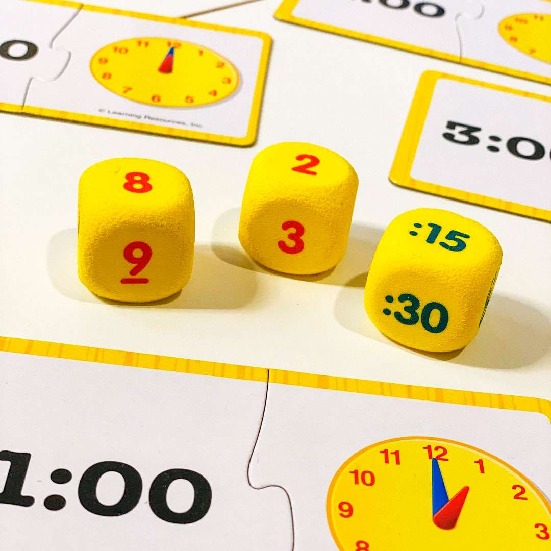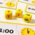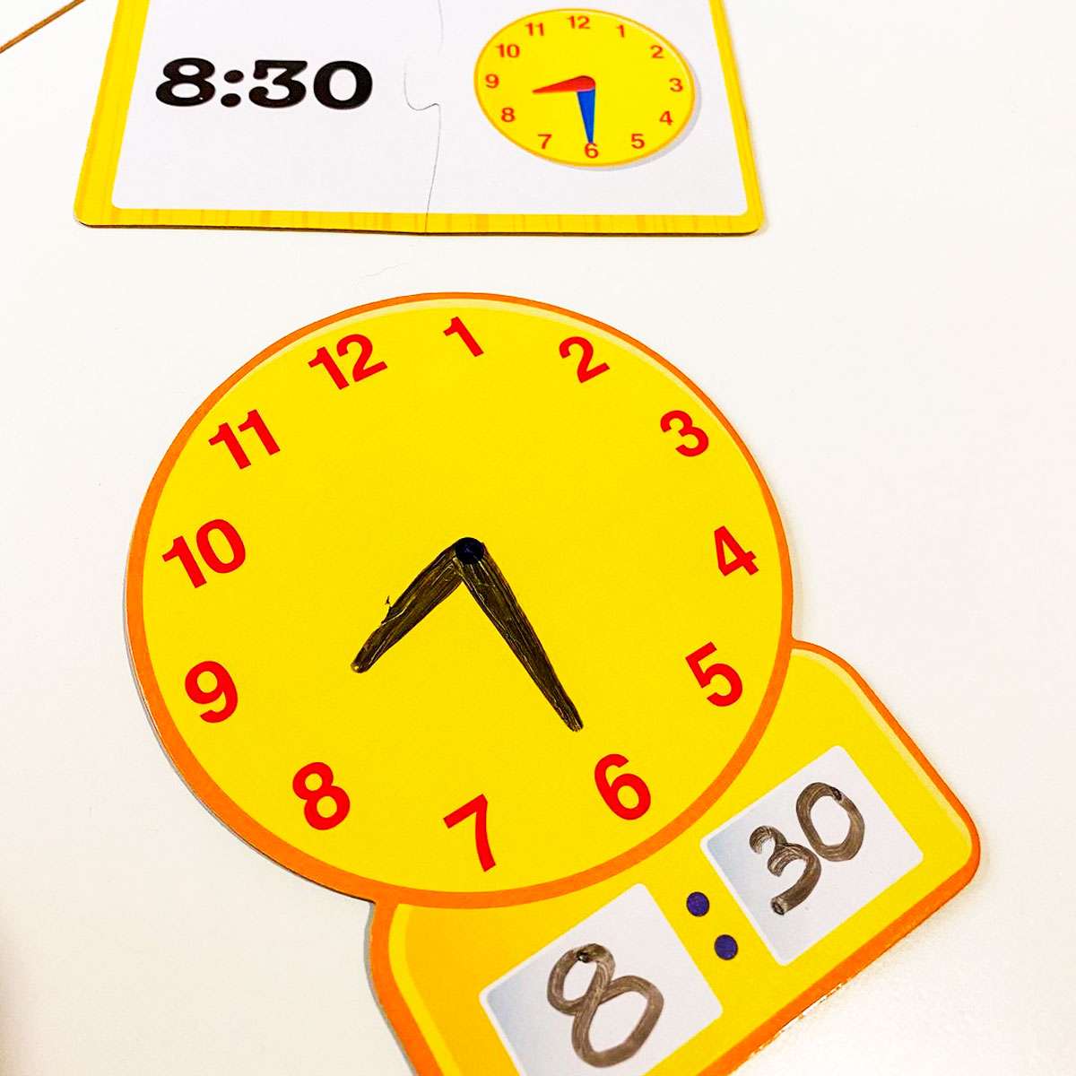 | В комплект входить | 3 кубики, макет годинника, 24 картки-пазли, циферблат, 12 карток |