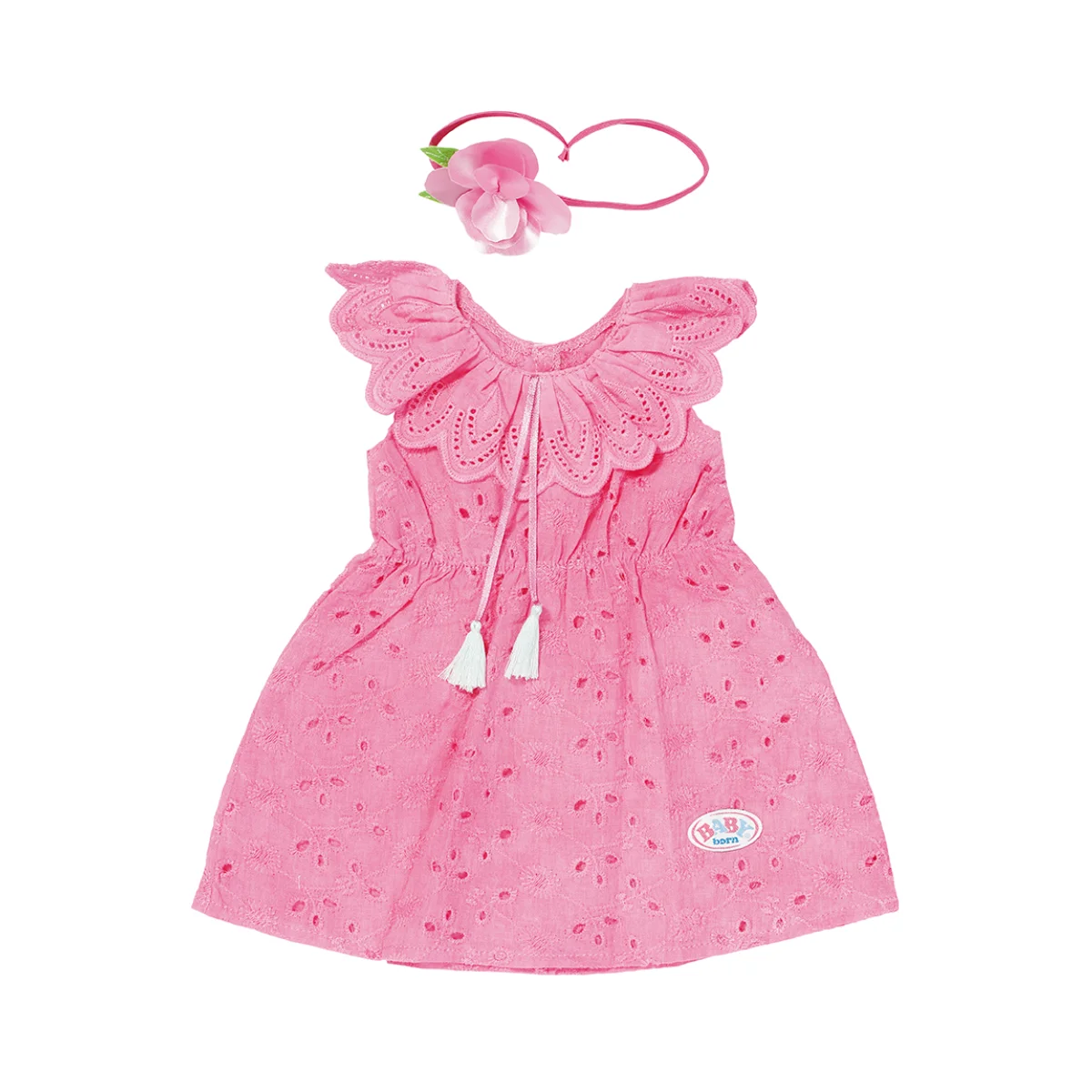 Стильні дівчатка-квіточки просто обожнюють це вбрання. Сукня з рожевого мереживного полотна має детально продуманий комірець, з якого звисають рожеві стрічки з грайливими китицями. До вбрання маленька модниця носить обідок для волосся з квіточкою. Сукня зроблена за технологією easy fit – він легко одягається та знімається за допомогою липучок. Одяг виготовлено з високоякісних матеріалів.