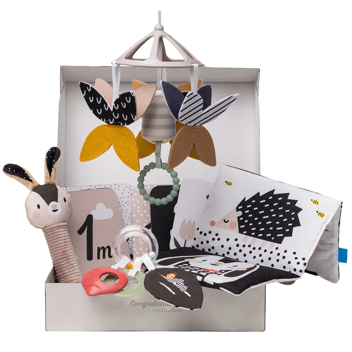 Подарунковий набір іграшок для новонародженого колекції “Садочок у місті” – ЧОРНО-БІЛА ГАРМОНІЯ — це ідеальний старт для розвитку малюка з перших днів життя. Контрастні чорно-білі кольори, м’які текстури, звуки та форми сприяють розвитку зору, слуху, моторики та емоційного сприйняття.