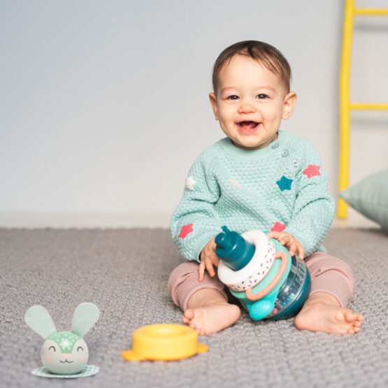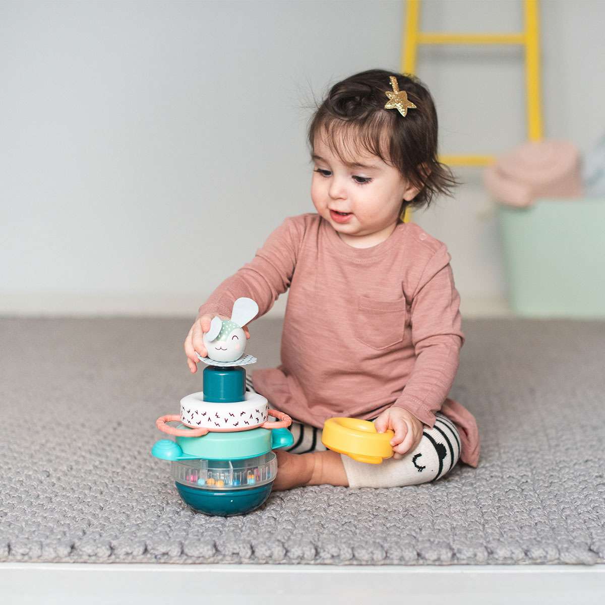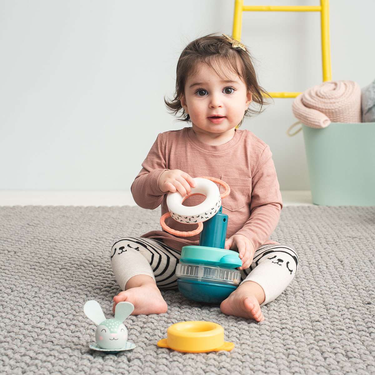 Малюк може не тільки весело грати з кроликом, але і розвивати логічне мислення, збираючи пірамідку.